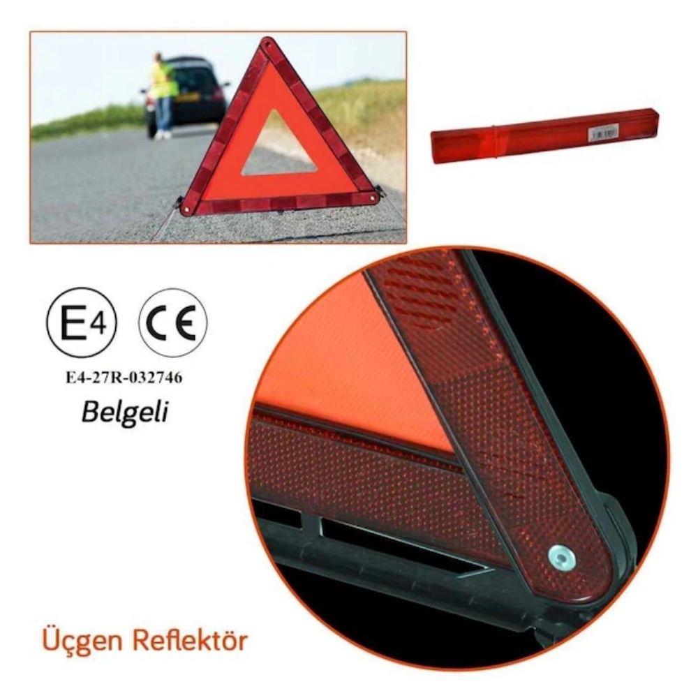 Üçgen reflektör, araç arızası veya kaza anında diğer sürücüleri uyarmak için kullanılan, yansıtıcı yüzeye sahip, kırmızı renkli zorunlu bir güvenlik ekipmanıdır. Şehir içinde 30 metre, şehirlerarası yollarda 100-150 metre uzağa yerleştirilmelidir. Araç muayenesi (TÜVTÜRK) için genellikle 2 adet bulundurulması şarttır.